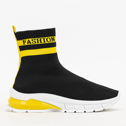 - Comfortable women's sports shoes with rubber sole, high uppers. The upper and the insole are made of fabric material, decorated with yellow stripes. They will go great with jeans!