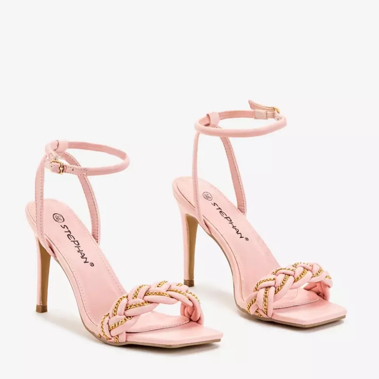 - Beautiful women's sandals on a high heel, decorated with a gold chain. The pair is entirely made of ecological leather. There is an adjustable strap around the ankle fastened with a buckle. Note: the product has scratches on the material.