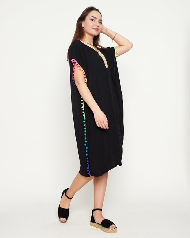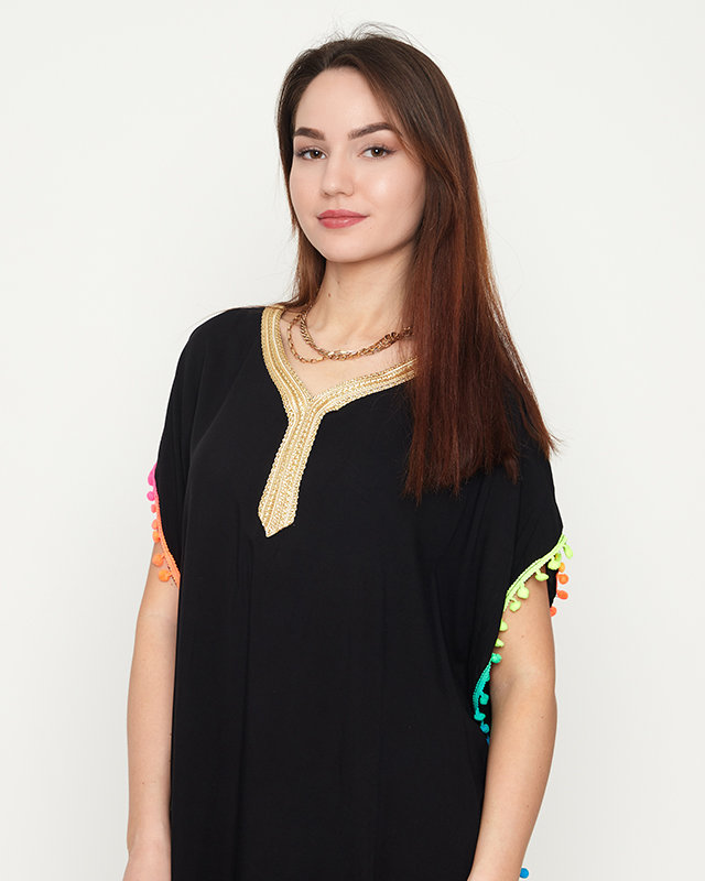 • Light and pleasant to the touch women's beach tunic, made of cotton fabric. The V-neck model is decorated with multicolored pompoms. Oversize cut ensures fit to every figure! NOTE: Measurement accuracy (+/-) 1 cm.
