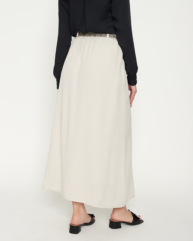 - Women's midi length skirt made of pleasant cotton material. Elastic rubber at the waist and a braided belt. Buttoned model. NOTE: Measurement accuracy (+/-) 1 cm.