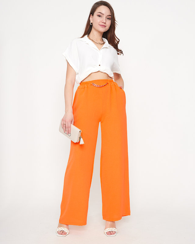 - Super stylish women's wide palazzo pants, decorated with chain. The model is made of light and airy fabric, has a wide elastic waistband and two slip pockets. Perfect for creating fashionable outfits! NOTE: Measurement accuracy (+/-) 1 cm.