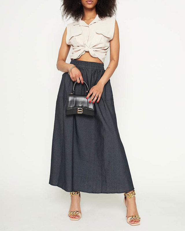- Classic ladies' calf-length skirt made of cotton fabric. The model with a flared cut, has an elastic waistband, two slip pockets on the sides. The perfect base for everyday use! NOTE: Measurement accuracy (+/-) 1 cm.