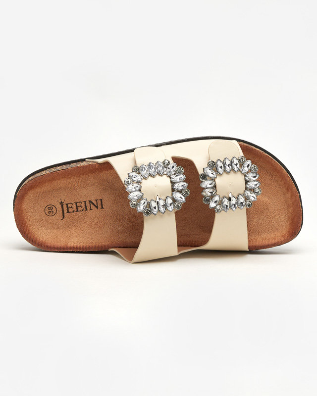 - Wonderful women's slippers made of ecological leather. Model with buckles decorated with cubic zirconia, has an eco-suede insert. Rubber sole decorated with a la cork material. A great addition to your casual outfits!