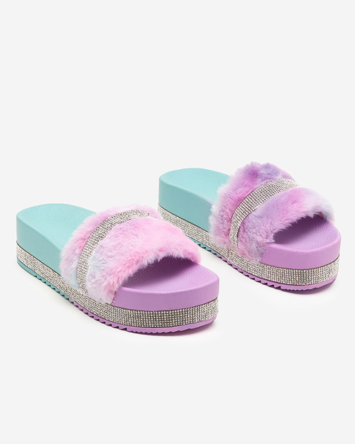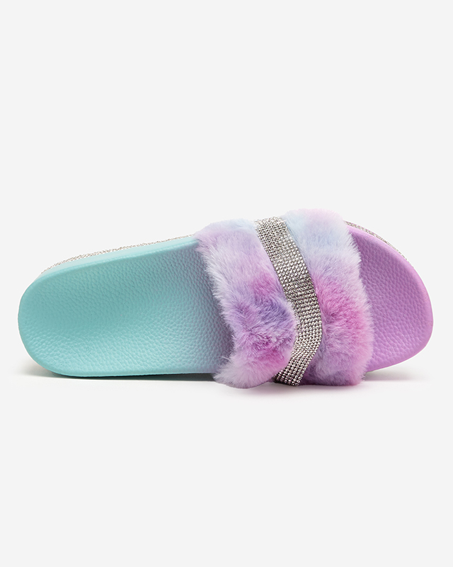Violet-mint women's slippers with fur and cubic zirconia Zerika - Footwear