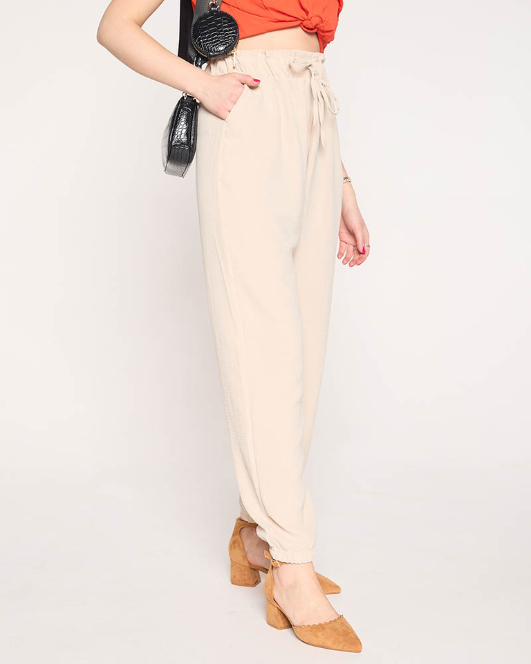 • Women's fabric pants made of airy and delicately cotton material. The model has an elastic waist and legs, and decorative strings at the waist. NOTE: Measurement accuracy (+/-) 1 cm.