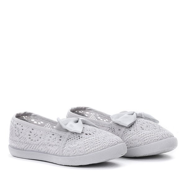 - Gray slip on sneakers for children. The material is made of a fabric with a lace finish. The upper is decorated with a satin ribbon. Perfect for everyday use! Note: the product has scratches on the material.