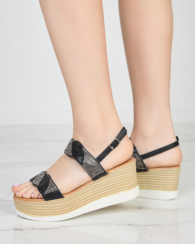 • Women's sandals on a 7.5 cm wedge, made of ecological leather. Eco-leather insole, buckle fastening on the side. Strips decorated with tiny cubic zirconia. Perfect shoes for a summer dress!