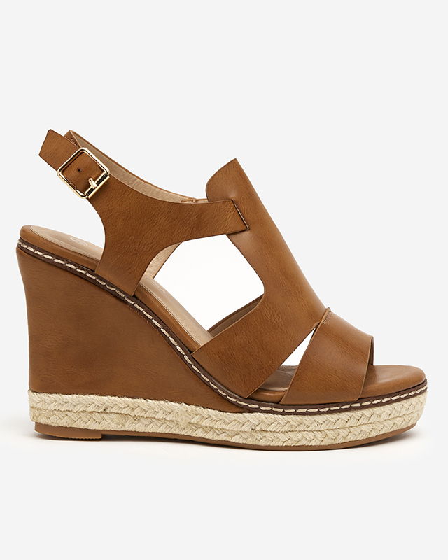 OUTLET Light brown women's sandals on a high wedge heel Clack - Footwear