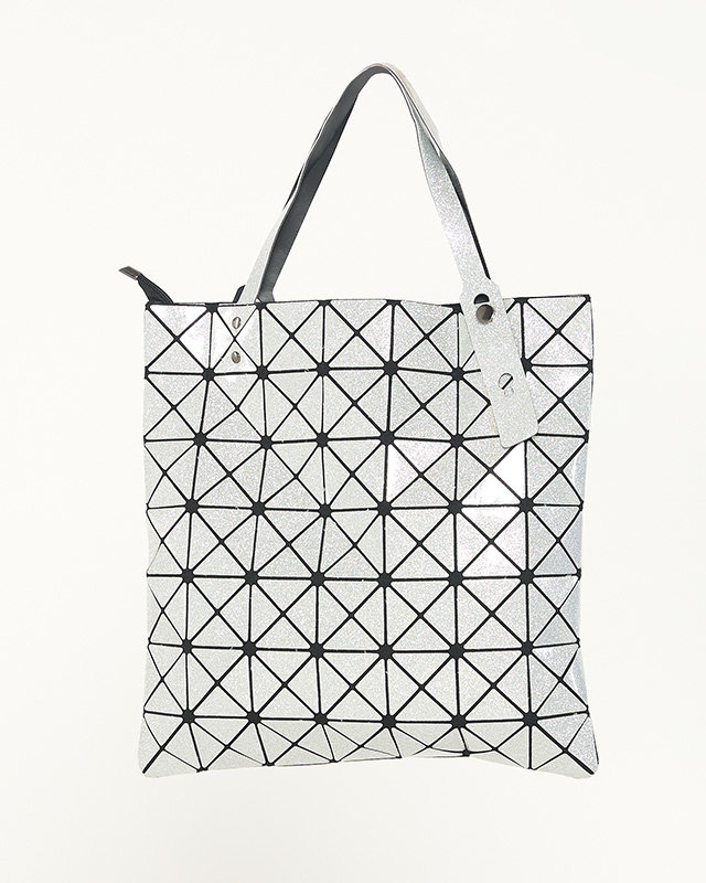 • Mega stylish handbag made of a combination of fabric and plastic. The material is decorated with a fashionable geometric pattern with a glitter finish. The model is fastened with a zipper and has one external slip pocket.
