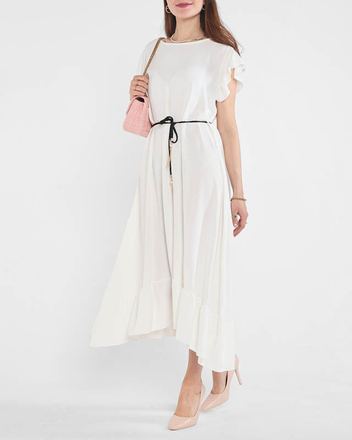 Women's white dress with frills and a tie belt at the waist - Clothing