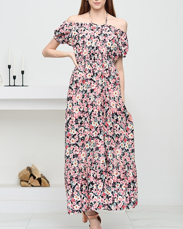Long summer black dress for women with light pink flowers - Clothing