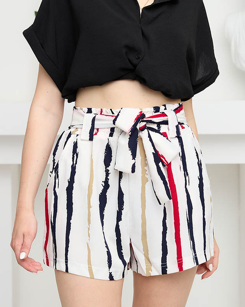 • Very comfortable and elegant shorts made of soft, pleasant fabric. Model with an elastic band and an additional belt at the waist. They are decorated with a striped pattern! NOTE: measurement accuracy (+/-) 1 cm. Dimensions measured flat.