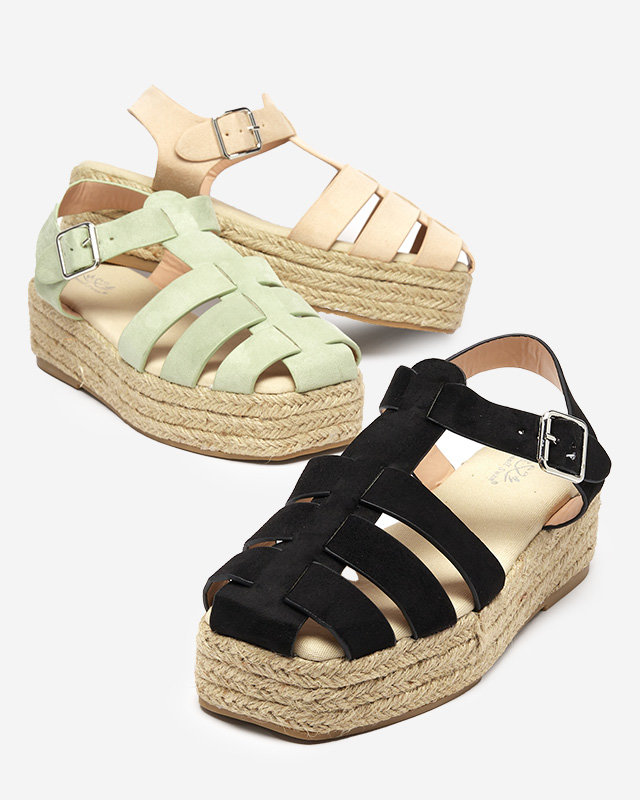 - Extremely comfortable and fashionable women's sandals made of a combination of ecological leather and eco-suede. Model with a square toe, on a platform covered with a jute string, fastened with a buckle at the ankle. A brilliant choice for the summer!