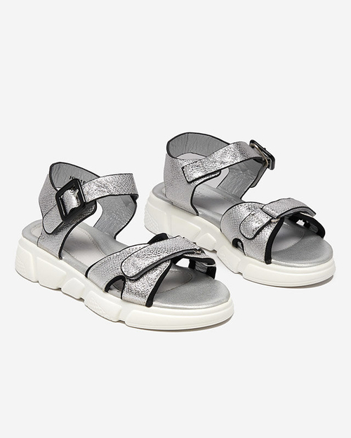 • Effective girls' sandals on a flat sole, made of shiny fabric. Footwear fastened with a buckle around the ankle and Velcro on the toe. In the middle a soft, eco leather insole. Perfect for hot days!