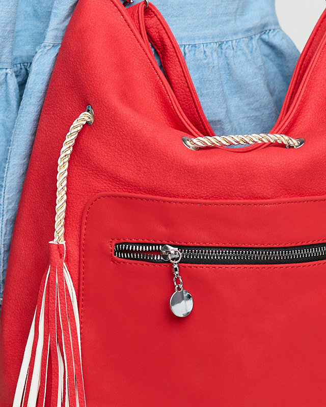 - Fashionable women's shopper bag fastened with a zipper, made of eco-leather with decorative strings. The model has: - 1 compartment, - 2 slip pockets and 4 zipped pockets, - a handle and a detachable belt that can be adjusted.