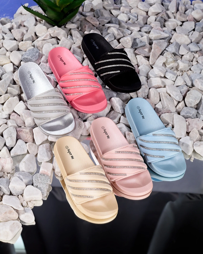 • Beautiful women's slippers on a flat sole, decorated with tiny cubic zirconia, insole made of rubber material. This beautiful couple must be in your suitcase during your vacation!