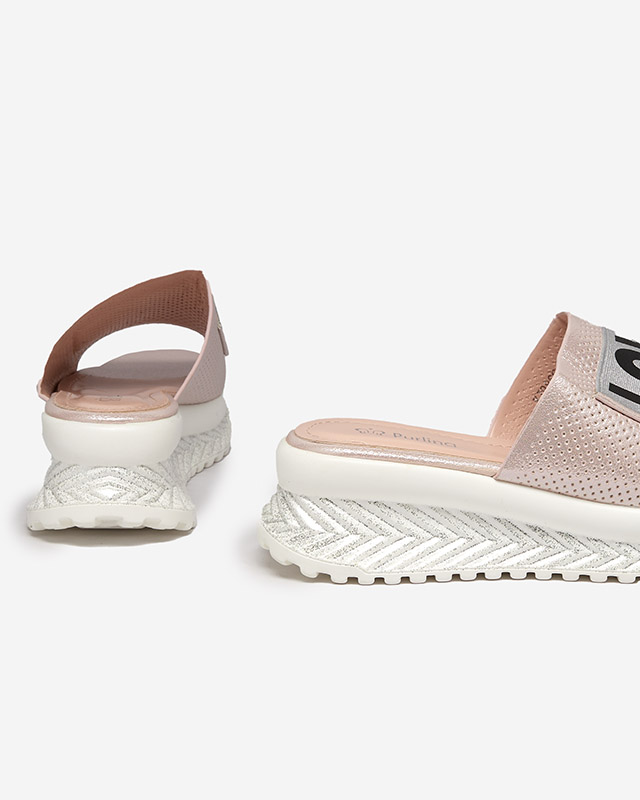 - Fashionable women's slippers on a low wedge heel, made of soft ecological leather. Model finished with glitter. Additionally, an inscription on the uppers. Put them on with shorts for the summer!