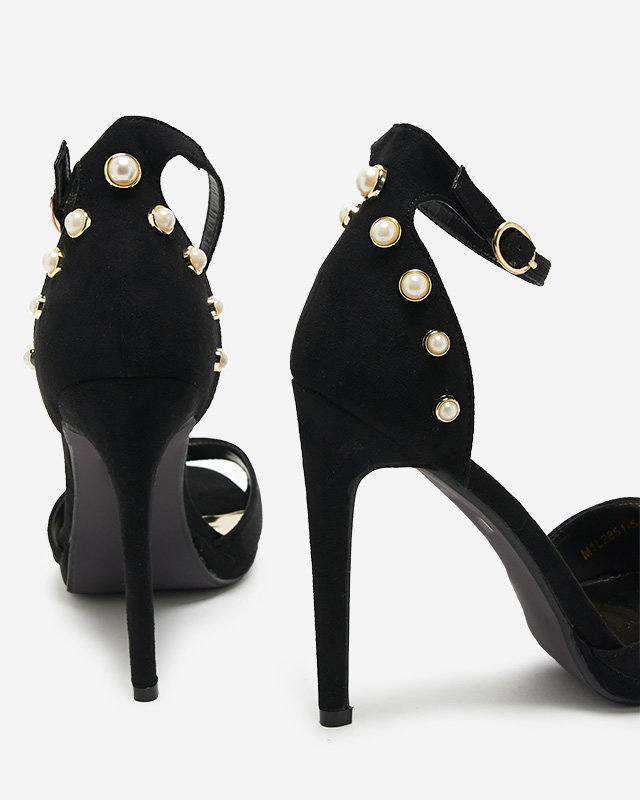 - Classic women's sandals on a high heel made of ecological suede leather. An adjustable strap around the ankle fastened with a buckle. Decorative pearls on the back add charm to them. Perfect for pants and dresses!