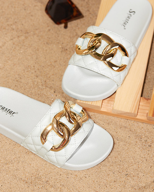 - This season's most fashionable women's slippers made of quilted ecological leather. The model is decorated with a large plastic chain in golden color. The insole and the sole are made of rubber. Note: the product has discoloration on the material.