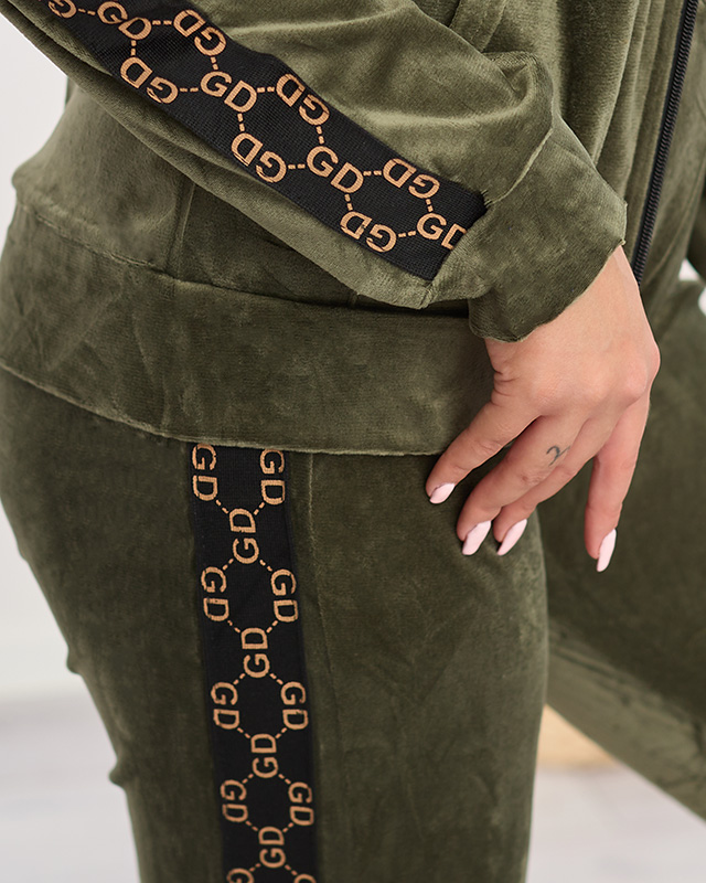 - Fashionable women's sweatshirt set made of a la velor material. Sweatshirt fastened with a zipper, has a hood and two pockets. Pants with an elastic waistband and slip pockets on the front. The product is decorated with stripes. NOTE: Measurement accuracy