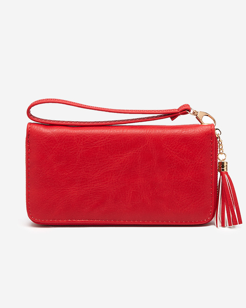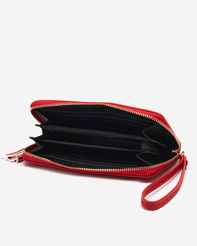 - Classic large women's wallet made of leatherette. Product fastened with a zipper and decorated with a tassel. The model has: - 2 compartments, including 1 zipped pocket for coins, - 12 pockets for payment cards or other documents