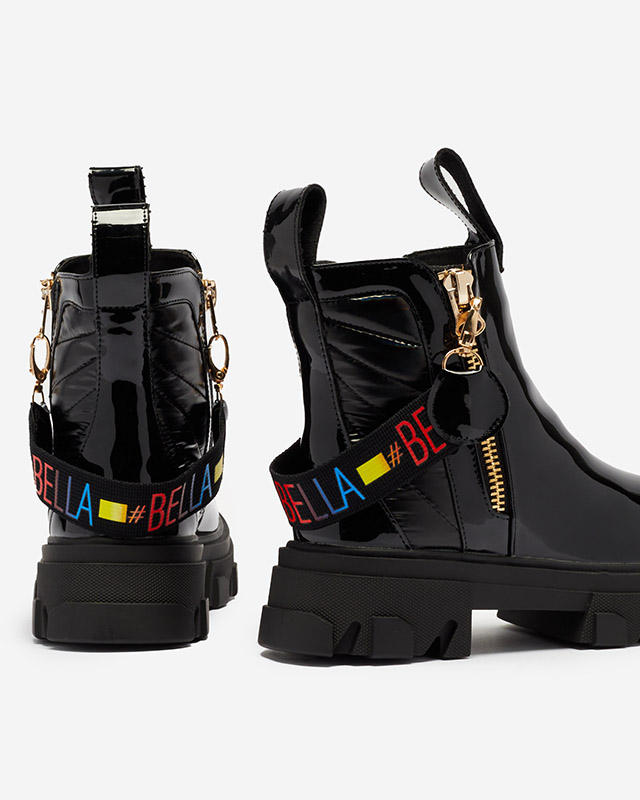 • Boots on a thicker sole made of ecological leather, have a delicate warming in the form of fur. The model is fastened with a zipper. The upper decorated with a detachable strap. BLACK WOMEN'S BOOTS ECO LEATHER PATENT OSALLU