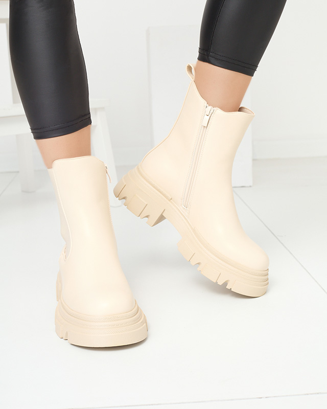 - Fashionable women's boots on a massive sole, made of ecological leather. The boots are fastened with a zipper, and inside there is a delicate fur lining. The pair has a flexible insert on the side and a rubber sole. BEIGE SHOES WARMED BOOTS