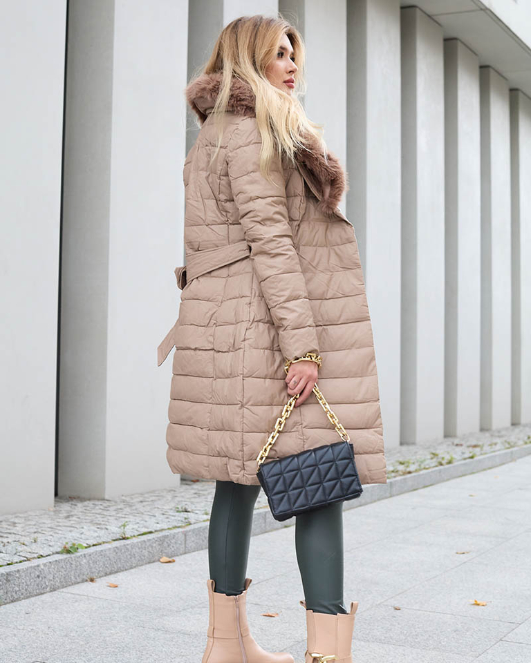 - Simple women's winter jacket with detachable, warm fur. The upper part inside also has a soft fur. The jacket is fastened with a zipper and buttons, has 2 zipped pockets and a belt on the back. Great for winter time!