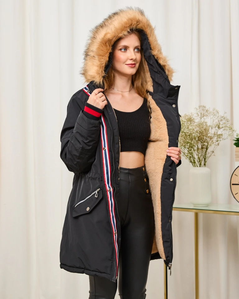 - Ladies' insulated winter jacket with hood and detachable fur trim. The model is fastened with a zipper and buttons, has 2 pockets and drawstrings emphasizing the waist. Perfect for colder days! NOTE: Measurement accuracy (+/-) 1 cm.