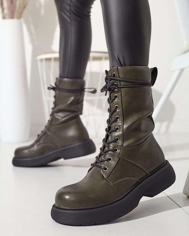 - Classic women's high-heeled boots with flat heels. The laced upper is made of ecological leather, and the inside is lined with fabric material. A great addition to your casual outfits! DARK GREEN UNINDED SHOES FERSIS BOOTS