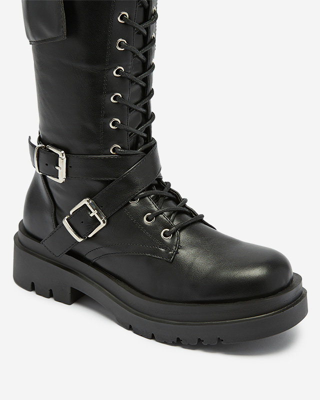 - Black workery boots, mid-calf with decorative stripes on the upper. The model is made of eco leather. Fabric sockliner. They have a zipper and additional laces. Perfect for autumn days! BLACK LADIES 'WORKERY BOOTS IMIELIN