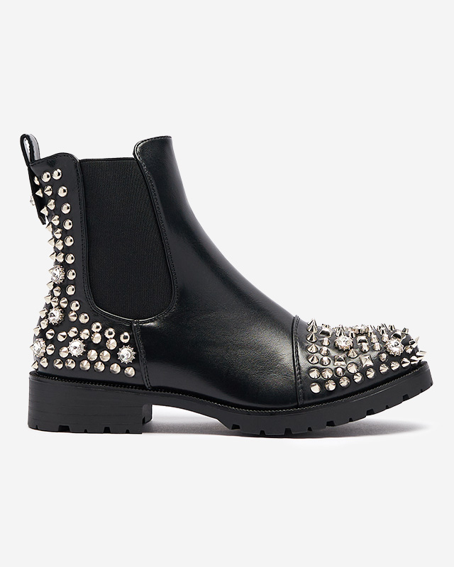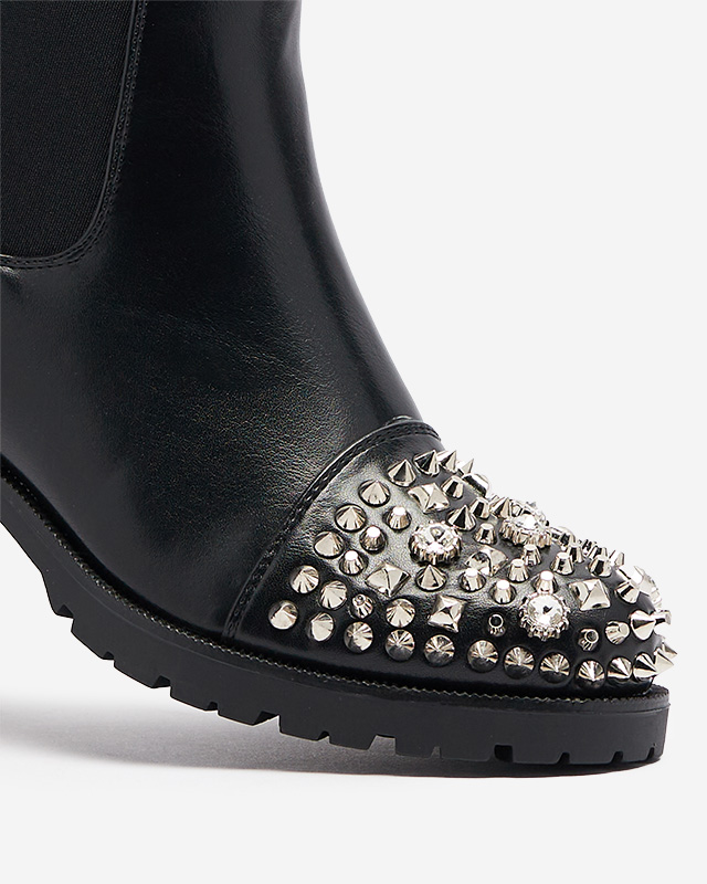- Stylish women's boots with flat heels made of ecological leather. Footwear insulated with soft fur. Slip-on model, has elastic inserts on the sides. The upper decorated with studs. BLACK INSULATED BOOTS AMERAPI