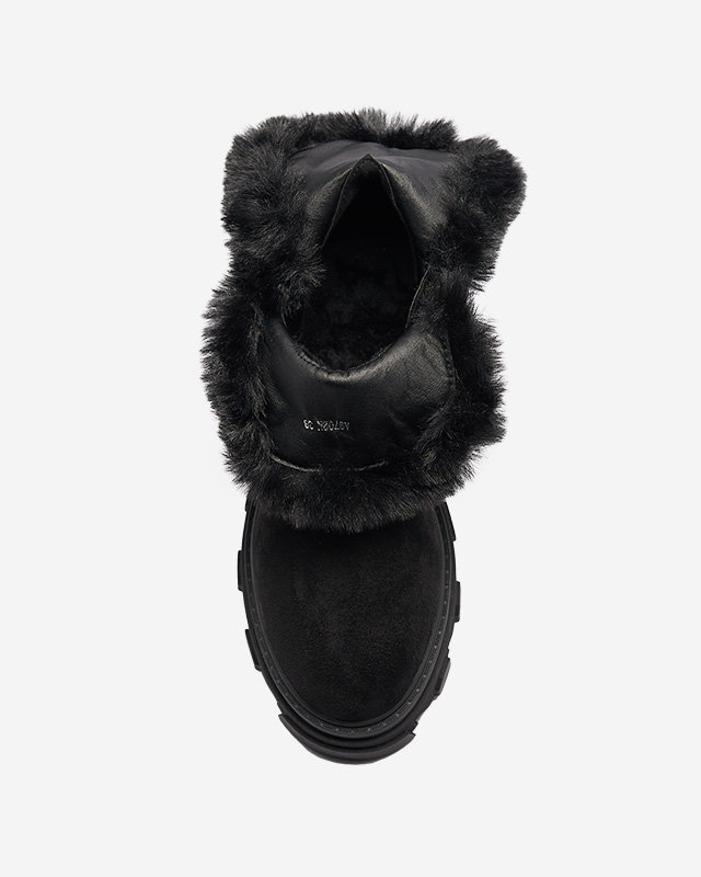 - Timeless women's flat-heeled boots, decorated with a gold-colored chain. The pair is made of organic suede leather, the middle is partially insulated with soft fur. On the side there is a zipper closure. BLACK INSULATED VIDERIC BOOTS