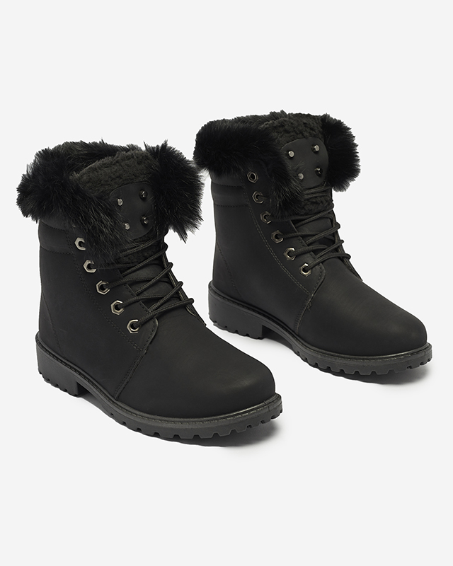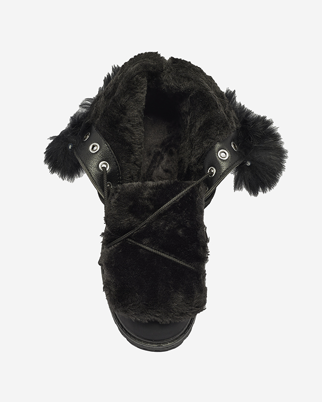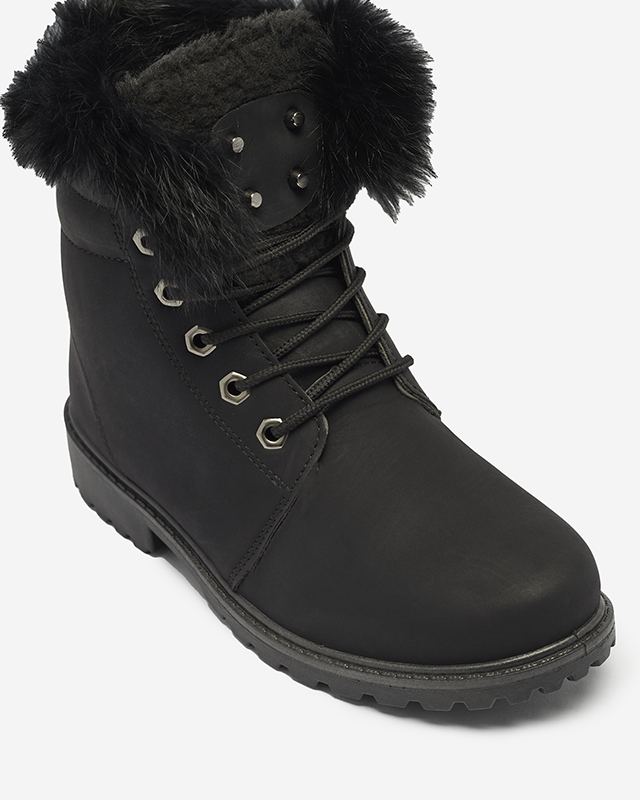 - Classic women's lace-up winter trapper boots. The upper is made of organic leather with a matte finish, the middle is insulated with soft fur. The pair is decorated with fur in matching color. BLACK INSULATED SHOES WOMEN'S TRAPPERS LAUSA