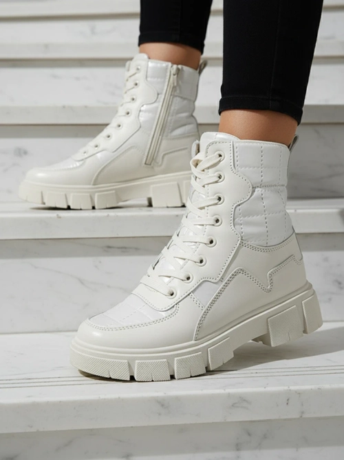- Excellent women's lace-up a'la worker boots, the upper is made of a combination of ecological leather and artificial material a'la oilcloth with a quilted finish. The inside is lined with fabric. CREAM UNINSULATED TRAPPER BOOTS QERTERA