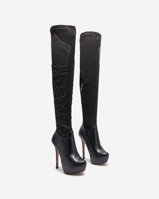 - Elegant stiletto and platform boots made of eco leather and eco suede. The insole is fur. Over-the-knee model, with a round nose, zipped up to the middle of the calf. The upper is decorated with zircons. BLACK WOMEN'S BOOTS BOOTS AGIOCIO