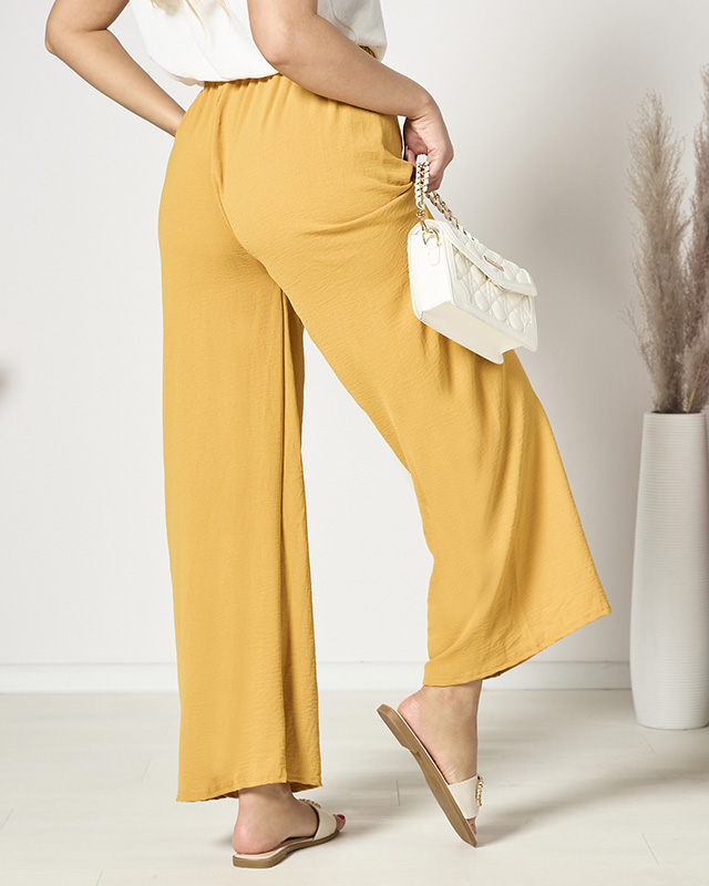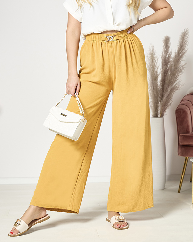 • Fashionable women's wide palazzo pants. The model is made of light and airy fabric, has an elastic waistband and a gold-colored metal embellishment. Perfect for everyday wear! NOTE: Measurement accuracy (+/-) 1 cm.
