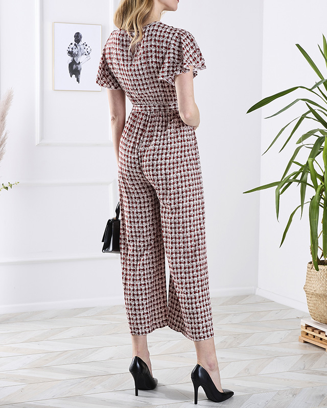 - Patterned women's jumpsuit with short sleeves and envelope neckline. The model has wide, long legs, an elastic band and binding at the waist. An ideal choice for those who appreciate comfort. NOTE: Measurement accuracy (+/-) 1 cm.