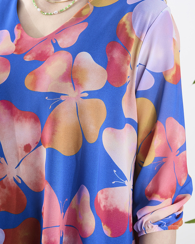 • Stylish dress with a loose oversize cut, with 3/4 sleeves ending in an elastic band. Material of manufacture - polyester. The dress has a heart neckline and is finished with a frill. Knee-length model, decorated with a print. NOTE: Measurement accuracy (+