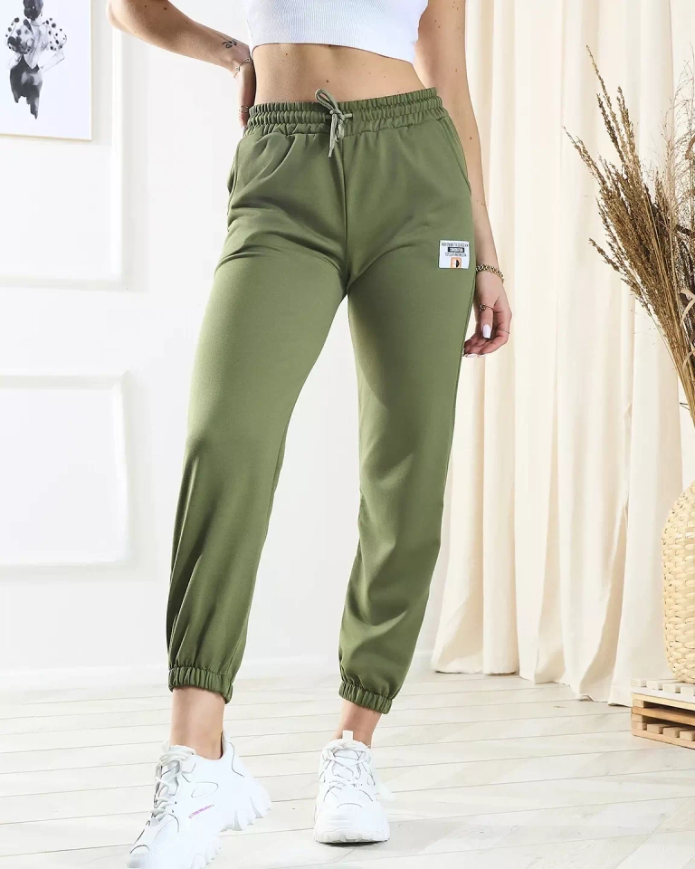 - Women's sweatpants with 2 slip pockets, have elastic waist and leg bottoms. Tied trousers at the waist, decorative patch on the side. Pants available in many color variations. NOTE: Measurement accuracy (+/-) 1 cm.