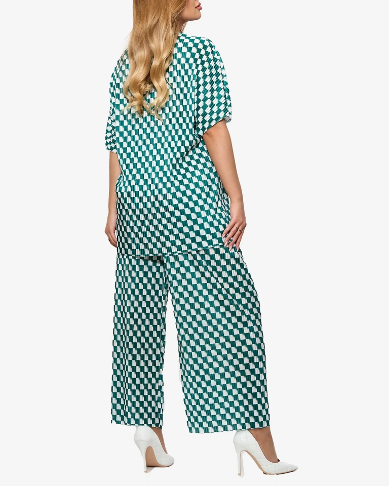 - Women's patterned set, made of slippery pleated fabric. The blouse with a round neckline has short sleeves. Palazzo pants with a wide pride of place at the waist and decorative ties. NOTE: Measurement accuracy (+/-) 1 cm.