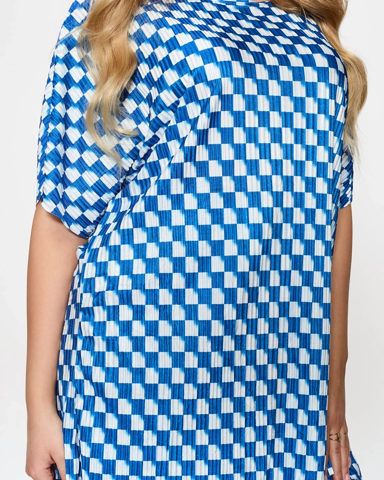 - Women's patterned set, made of slippery pleated fabric. The blouse with a round neckline has short sleeves. Palazzo pants with a wide pride of place at the waist and decorative ties. NOTE: Measurement accuracy (+/-) 1 cm.