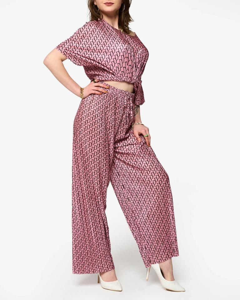 • Stylish women's set, made of slippery patterned pleated fabric. The blouse with a round neckline has short sleeves. Palazzo pants with a wide pride of place at the waist and decorative ties. NOTE: Measurement accuracy (+/-) 1 cm.