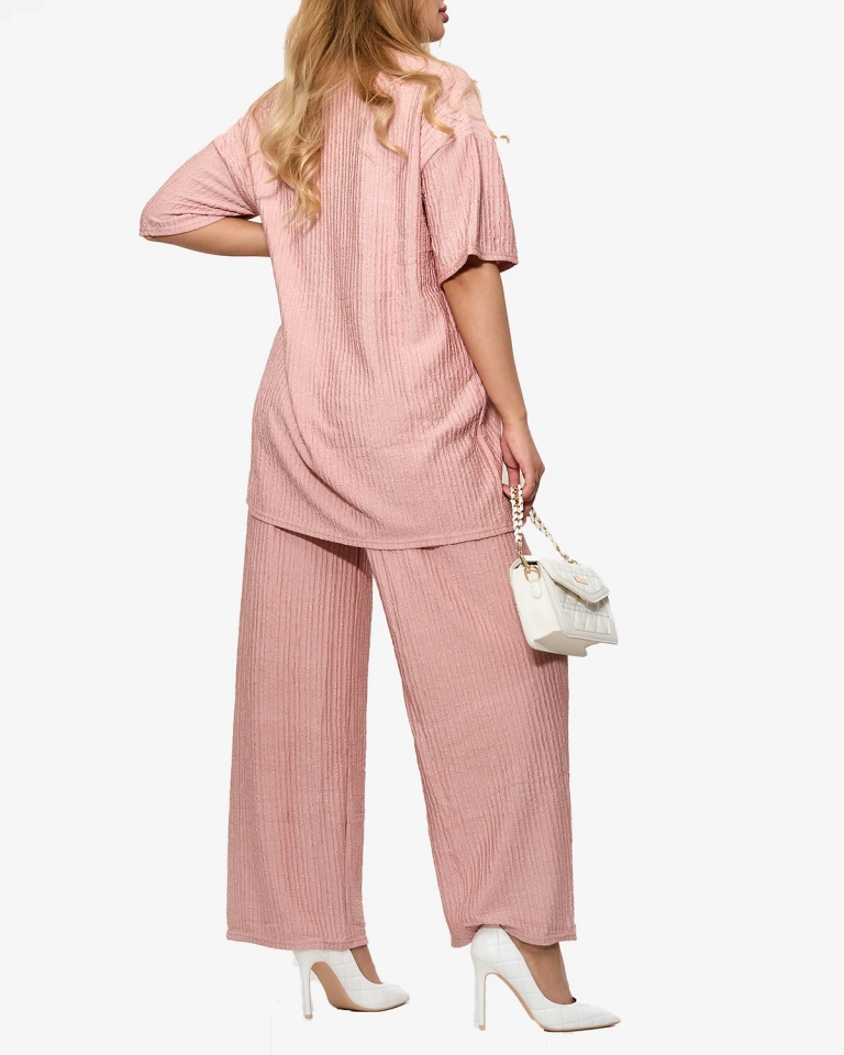 - Women's set made of stretch ribbed fabric. Blouse with short sleeves and round neckline. Long palazzo pants with high waist, elastic band and waist ties. A stylish and comfortable combination! NOTE: Measurement accuracy (+/-) 1 cm.