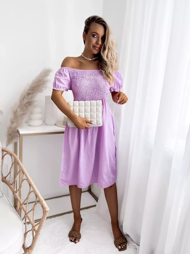 - Delicate women's mini length dress made of viscose fabric. Model with a hiszpana neckline with elastic at the shoulders and waist. The dress has short sleeves. Ideal for vacations! NOTE: Measurement accuracy (+/-) 1 cm.