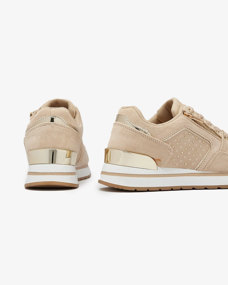 - Stylish women's sports shoes made of organic suede leather, have metallic inserts. Lace-up upper, decorated with zircons, decorative zipper on the side, and fabric insole. Super accessory for mom jeans and a hoodie or shirt!