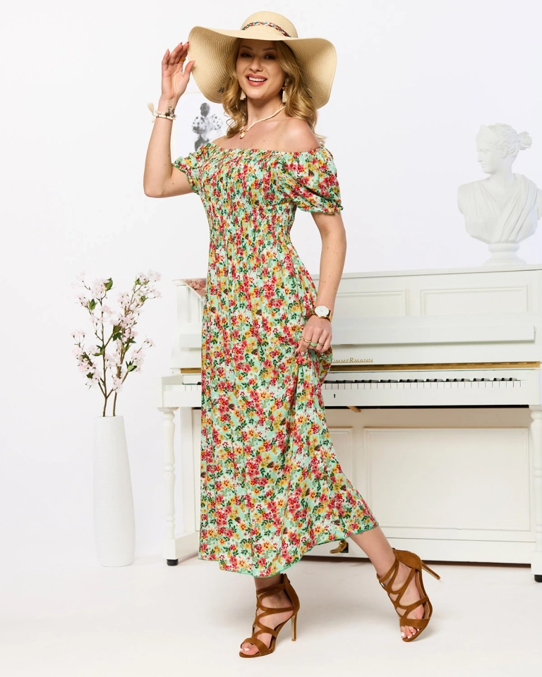 - Summer women's midi length dress, made of cotton fabric with floral pattern. Model with a round neckline a'la hiszpanka and elastic at the width of the bust and waist. Model with short sleeves. Wear it with sandals! NOTE: Measurement accuracy (+/-) 1 cm.