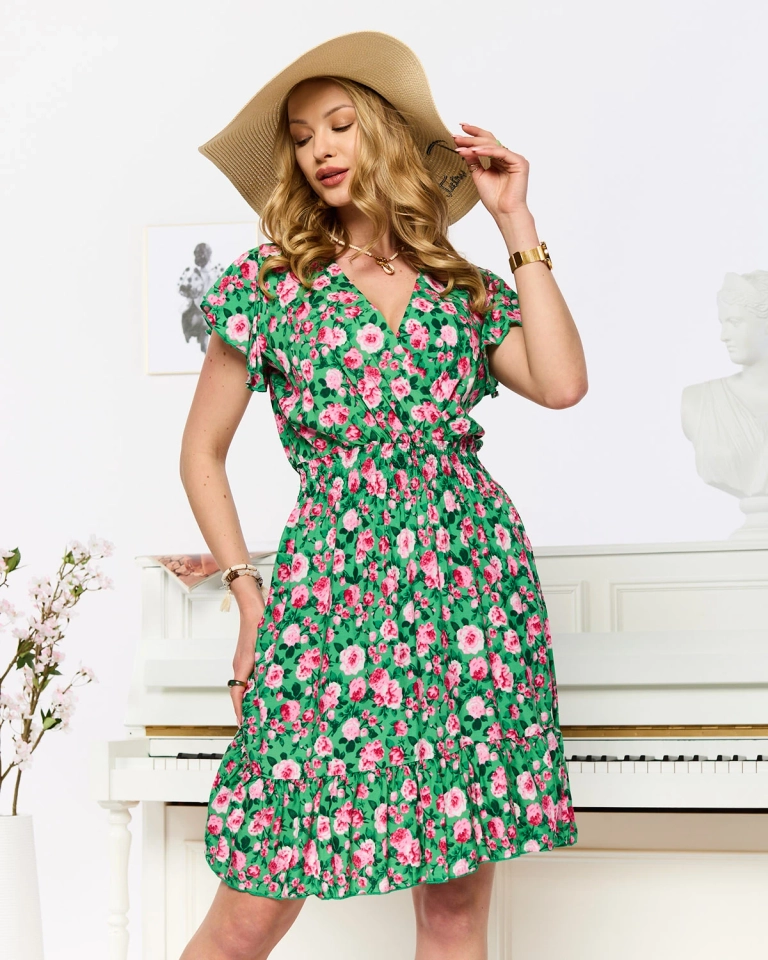 - Women's short dress, made of lightweight fabric with floral print. Model with an envelope neckline and short sleeves. It has an elastic band to emphasize the waist. Perfect with sandals! NOTE: Measurement accuracy (+/-) 1 cm.