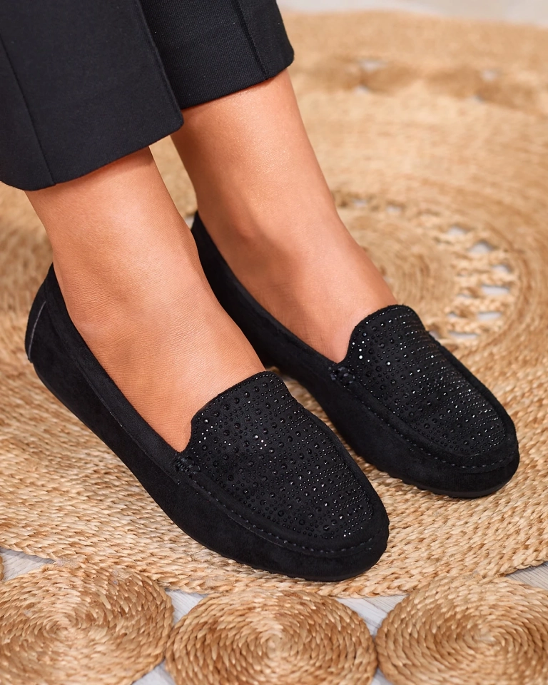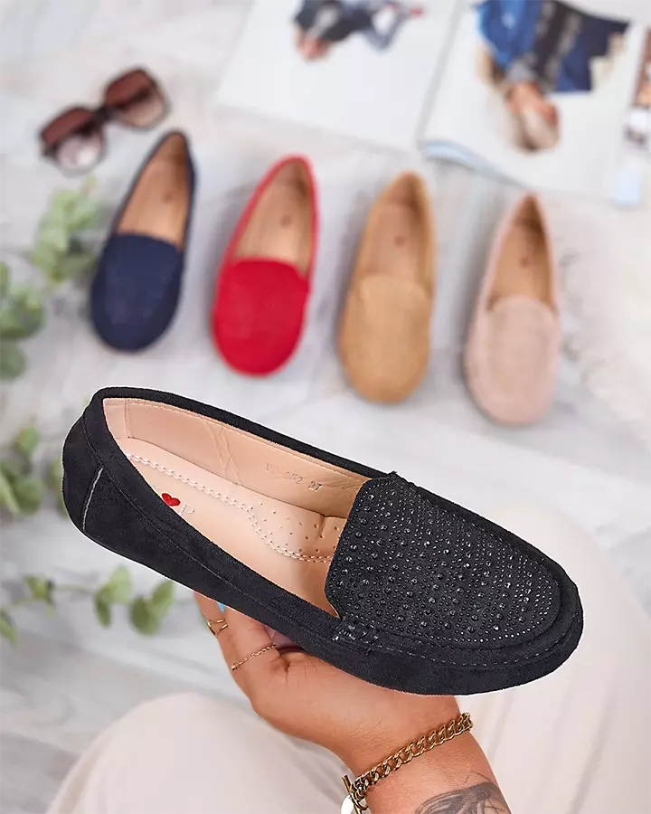 • Fashionable women's moccasins decorated with small zircons in matching color. The upper is made of organic suede leather, with a soft cushioned insole inside. Super addition to your casual outfits!