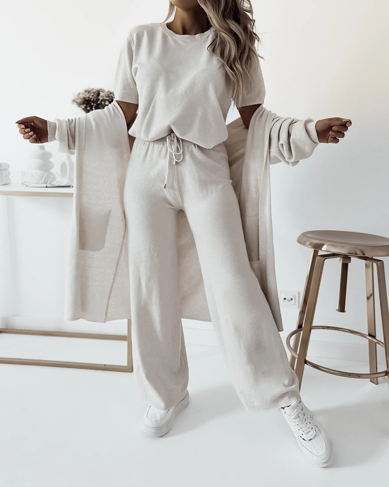 - Discover absolute comfort and style in this 3-piece set. It consists of a cardigan with a hood and pockets, wide pants and a short-sleeved sweater - all made of pleasant fabric. NOTE: Measurement accuracy (+/-) 1 cm.